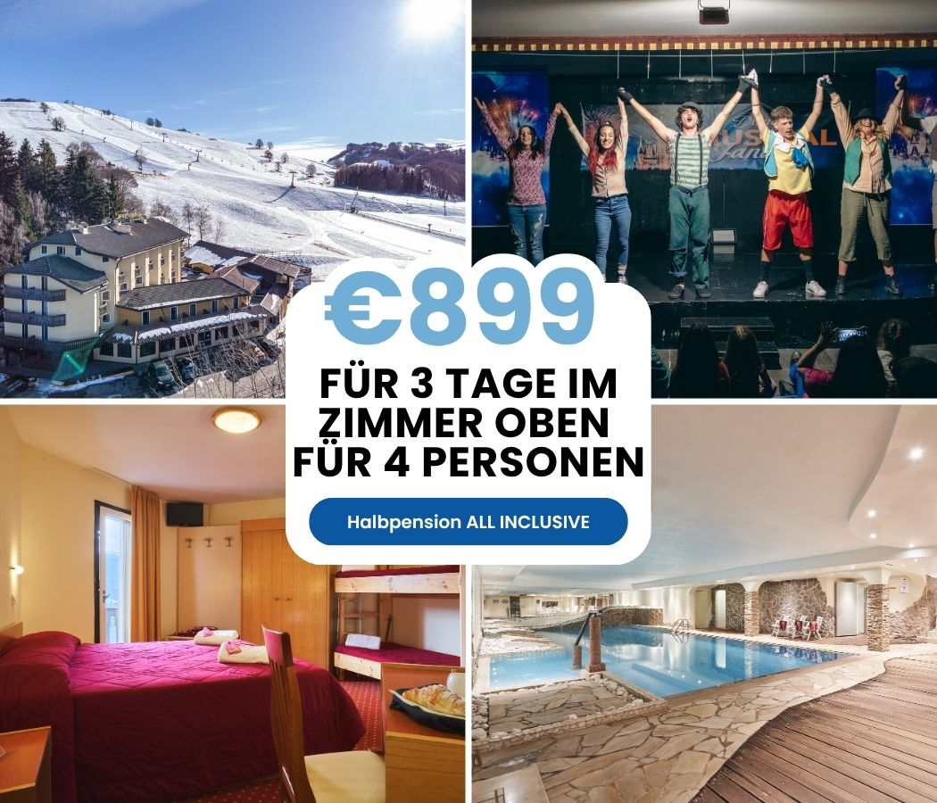 Melden Sie sich an3-Tage-Angebot mit 2 Skipässen pro Zimmer inklusive Halbpension All Inclusive vom 27. bis 30. Dezember für 899 € bis zu 4 Personen im Zimmer