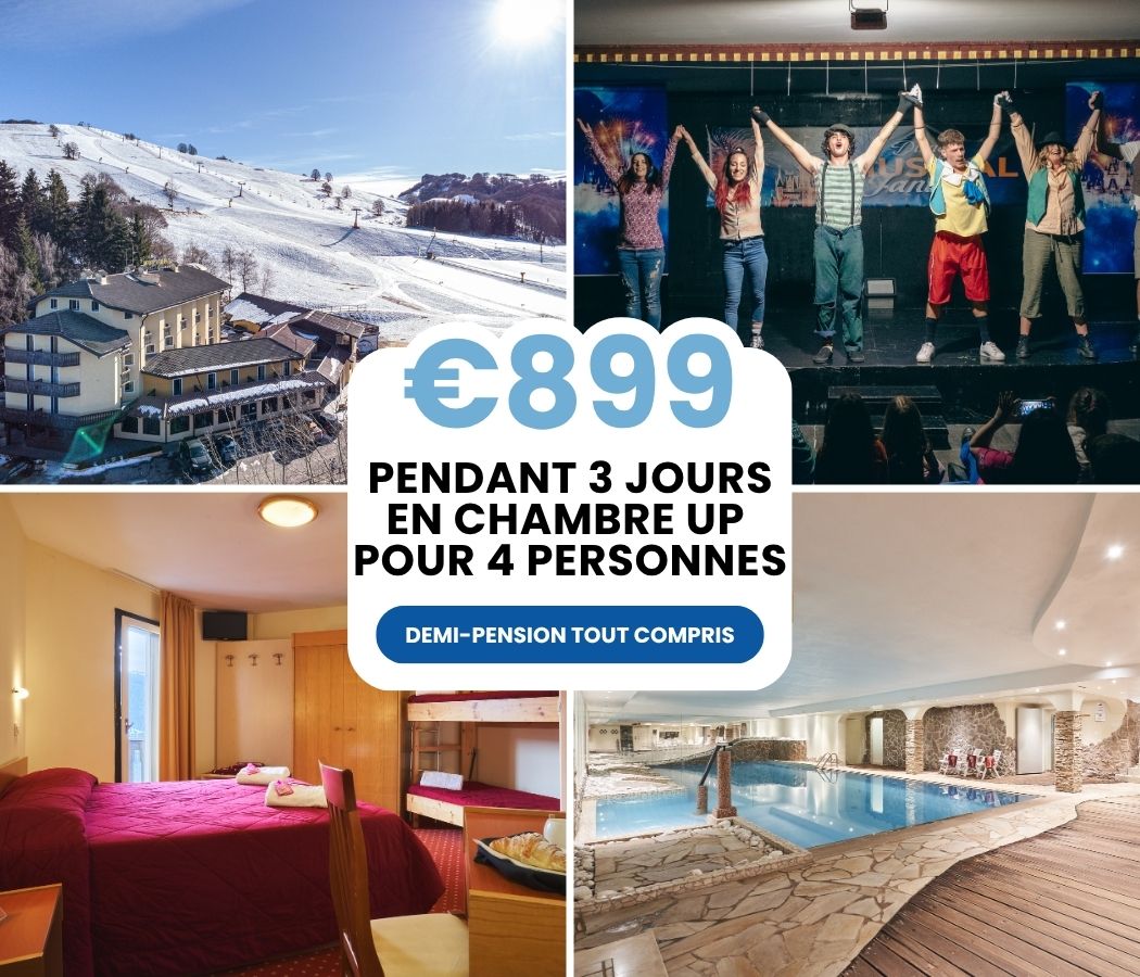 S'inscrireOffre 3 jours avec 2 forfaits inclus par chambre en demi-pension tout compris du 27 au 30 décembre à 899 € jusqu’à 4 personnes en chambre